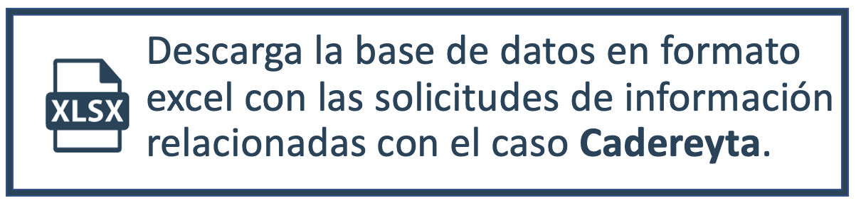 La siguiente base de datos en formato excel contiene las solicitudes de acceso a la información relacionadas con el caso Cadereyta. La base de datos se obtuvo de los registros que alberga la Plataforma Nacional de Transparencia (https://www.plataformadetransparencia.org.mx/) a través de una búsqueda con los siguientes criterios: 1) Palabra clave “Cadereyta”, 2) Periodo de búsqueda: Del 12 de junio de 2003 al 15 de marzo de 2022.